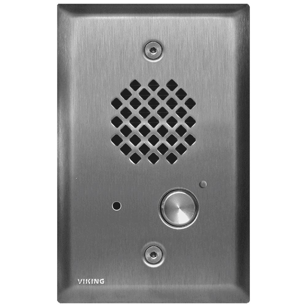 The E-40-SS-EWP entry phone can share a single phone line with house or small business telephones when used with a Viking C-200, C-250, C-500 or C-2000B Entry Phone controller. The E-40-SS-EWP entry phone can also be connected to an unused analog station port (programmed for ringdown) on a phone system or connected directly to a telephone line when used with a Viking K-1900-5 or K-1900-30 auto dialer. The E-40-SS-EWP features microphone and speaker volume controls, selectable auto answer for monitoring and intelligent call progress detection for automatic hang-up when the call is completed.