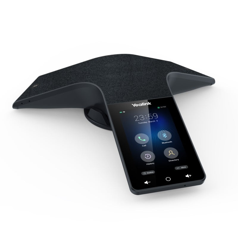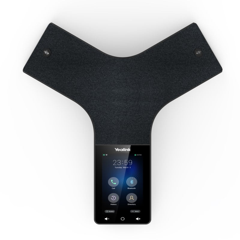 Yealink CP935W is a wireless touch-sensitive HD conference phone designed for small to medium conference room. CP935W adopts a business and introverted design that perfectly matches the calm style of the conference room, also adopts an acoustics fabric, which is impervious to any accidental liquid spills. Its fingerprint-proof LCD screen with a clear UI interaction page makes it easy for everyone to control the meeting. CP935W has built-in battery and Wi-Fi, you can register a SIP account directly through Wi-Fi. CP935W allows you to deploy without using power and network cable to provide you with a wireless and clean conference room. CP935W has 6 built-in microphones, providing you with a clear and natural conference call experience. In addition, you can also connect CP935W to your mobile devices (such as smart phone, personal computer, etc.) through Bluetooth or USB port to realize Hybrid UC meeting. Connect the CP935W to one Bluetooth wireless microphone CPW25 to expand the sound pickup distance while still keeping the conference room desktop tidy.