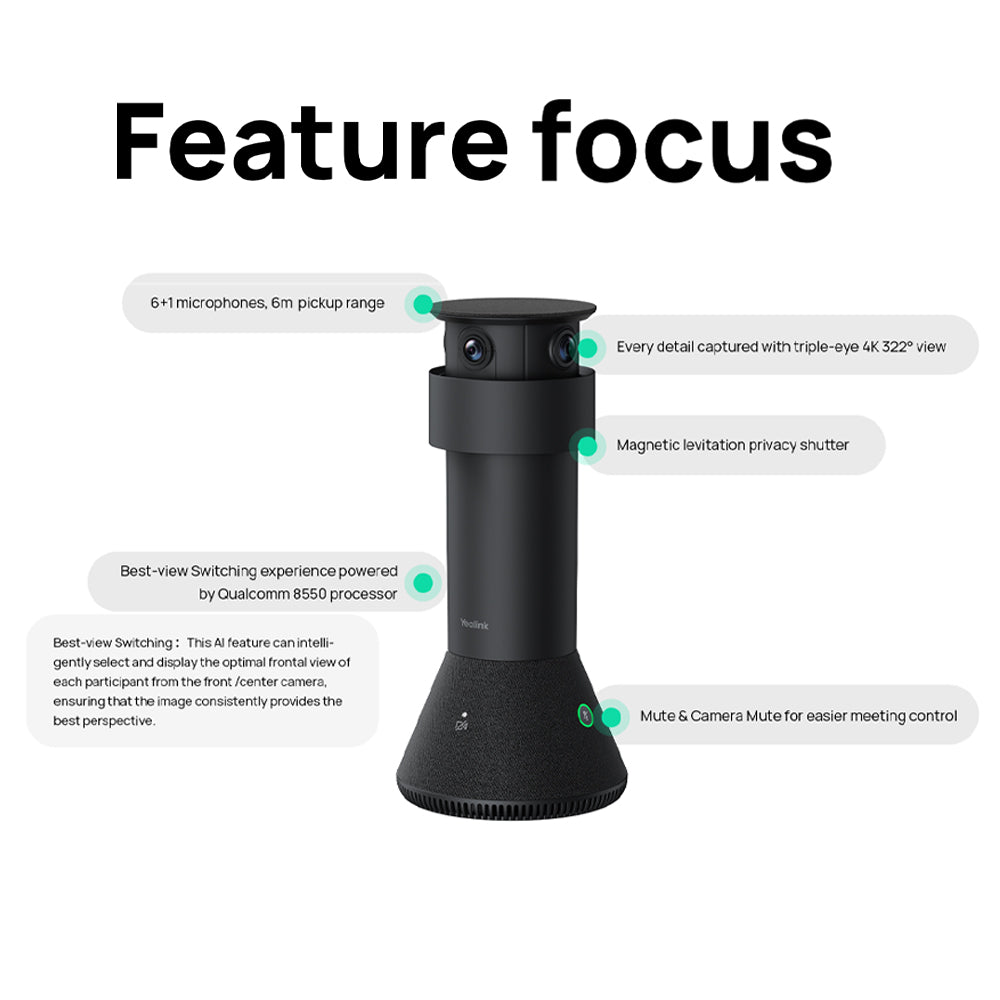 Yealink MTower is a triple-eye tabletop camera designed for small to medium meeting rooms. When it connects to MTR cameras, the optimal angles of all participants can be intelligently captured, enhancing the meeting experience. MTower features three cameras arranged in a ring, providing crystal-clear visibility of each participant around the table and capturing every detail with exceptional clarity. It also features 6+1 built-in mics at the top, enhancing the accuracy of sound source positioning. Furthermore, the cylindrical structure of MTower is both artistic and space efficient. To protect the privacy and security of meetings, MTower is designed with a magnetic levitation privacy cover to provide users with a secure experience.
